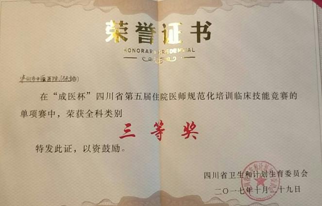 2017年10月29日,由四川省衛(wèi)生計(jì)生委主辦的“‘成醫(yī)杯’四川省第五屆住院醫(yī)師規(guī)范化培訓(xùn)臨床技能競(jìng)賽”在成都醫(yī)學(xué)院舉行。我院急診專業(yè)規(guī)范化培訓(xùn)學(xué)員張皓榮獲全科醫(yī)學(xué)技能比賽三等獎(jiǎng)。
