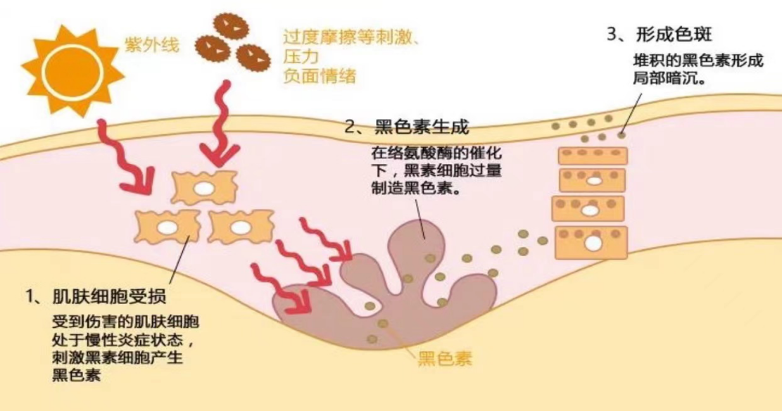 色斑形成原因很多,比如外部因素(紫外線、化妝及錯(cuò)誤使用護(hù)膚品),內(nèi)部因素(基因遺傳、內(nèi)分泌激素變化等)。