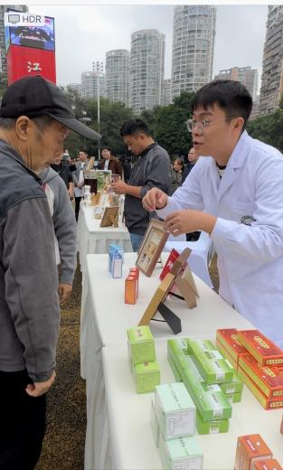 江陽(yáng)公園里的“煙火氣”中融入了“草藥香”。在一個(gè)鋪滿中藥標(biāo)本、飲片的“攤位”前,市民卓女士拿起一味中藥材看了看,“這是藿香?薄荷?”二者形狀有些相似,她不確定,便用手指碾碎后放至鼻間聞了聞,才給出肯定答案,“是薄荷,有清涼的味道?!薄皵偽弧鼻?,市民爭(zhēng)相排隊(duì)答題互動(dòng),辨認(rèn)中藥材贏獎(jiǎng)品。