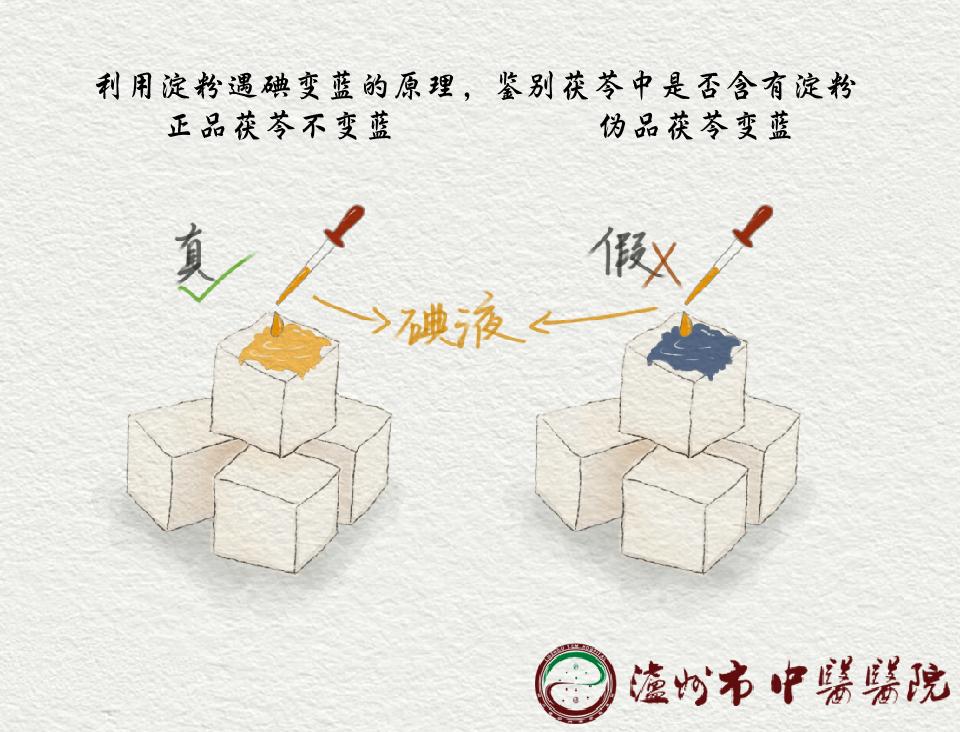 將碘酒/碘伏滴在茯苓上,正品茯苓遇碘不變色,若變?yōu)樗{(lán)色即為偽品茯苓(淀粉遇碘變藍(lán))。