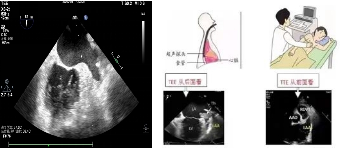 左心耳位于左心房的偏后上部分,大部分情況下被左心房主體部分遮擋,常規(guī)的經(jīng)胸超聲心動(dòng)圖(TTE)很難清晰顯示。TEE是超聲探頭置入食道內(nèi),從心臟的后方進(jìn)行檢查,縮短了超聲探頭與心臟及距離,避免了肺氣干擾、肋骨遮擋等弊端,可直觀的從左心房看到左心耳,排查左心耳內(nèi)有無血栓。目前我院開展了常規(guī)經(jīng)食道超聲心動(dòng)圖和無痛經(jīng)食道超聲心動(dòng)圖檢查。