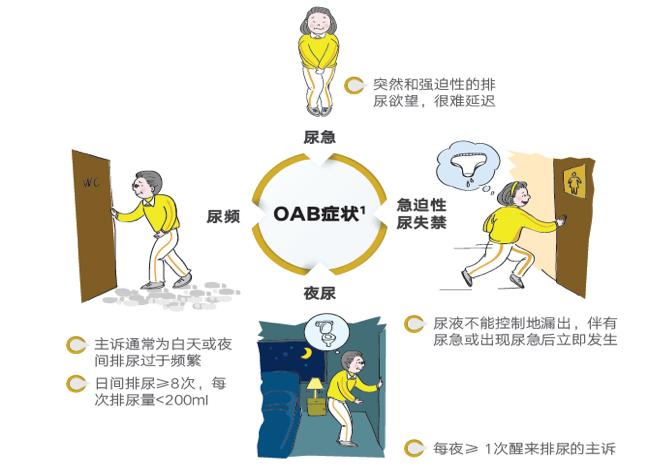 ④. 膀胱過度活動癥。又叫作OAB,一種以尿急癥為特征的癥候群,常伴有尿頻和夜尿癥狀,伴或不伴有急迫性尿失禁,沒有尿路感染或其他明確的病理改變。通俗地說,就是膀胱不受控制的過度活動,從而引起不停地上廁所,嚴重時甚至尿失禁。