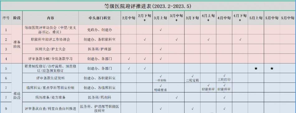 各家醫(yī)院在迎評啟動期,首先要統(tǒng)一認識:避免以考試的心態(tài)應(yīng)對,為了評審而評審,而是要把評審當(dāng)作抓手,以評促建、以評促進、以評促精,推進年度重點工作;其次要明確等級評審是一項全院行動、全員參與通力合作才能完成的工作,要發(fā)動全體院領(lǐng)導(dǎo)、中層干部、一線員工全流程全方位開展迎評整改工作;同步要制定醫(yī)院、科室(個人)迎評計劃,責(zé)任到人,相關(guān)職能部門主動檢查、督促整改,通過科室自查互查、職能部門督查、院領(lǐng)導(dǎo)巡查,全方位無死角的發(fā)現(xiàn)不足,制定對策,持續(xù)改進。
