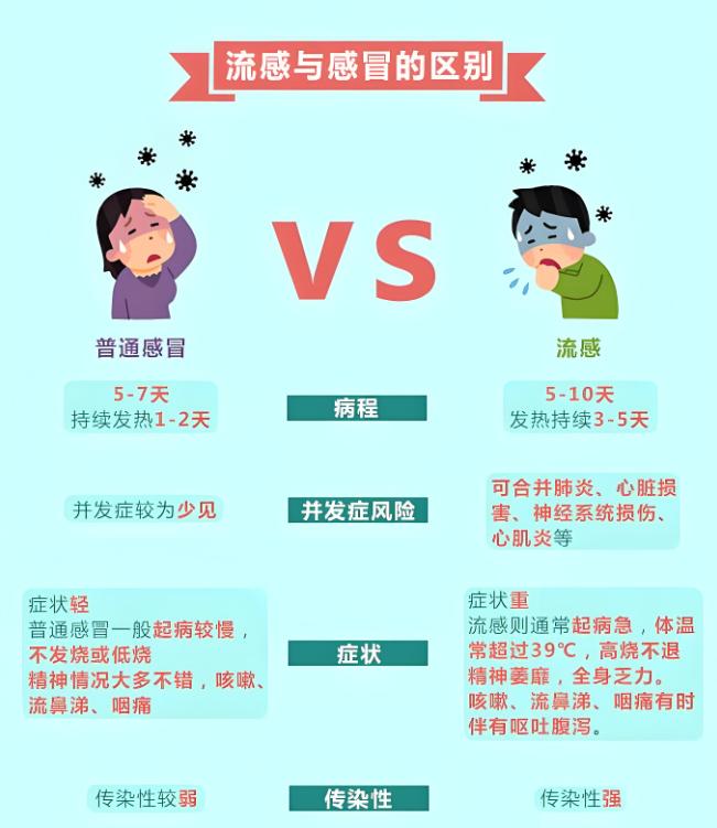 流感癥狀比普通感冒更加嚴(yán)重,主要表現(xiàn)為頭痛、高熱、關(guān)節(jié)酸痛、乏力等,普通感冒的癥狀相對較輕,主要表現(xiàn)咽喉痛、流涕、咳嗽等不適。流感的傳染性更強(qiáng),更容易在人群中傳播,流感嚴(yán)重時可引起病毒性肺炎,還能并發(fā)細(xì)菌性肺炎、中耳炎、心肌炎等嚴(yán)重的并發(fā)癥,普通感冒一般很少發(fā)生嚴(yán)重并發(fā)癥。