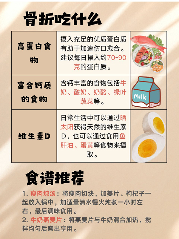 其實(shí),通常骨折后一般沒有太大的飲食禁忌,主要是不能吃一些辛辣刺激和生冷油膩的食物。以清淡易消化的食物為主,適當(dāng)喝一些骨頭湯,牛奶等補(bǔ)鈣的食物,可以促進(jìn)骨折處鈣鹽的沉積,加速骨折愈合。