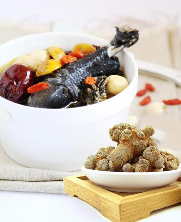 材料:骨碎補(bǔ)15克、丹參10克、豬骨300克、黃豆50克、姜片適量。