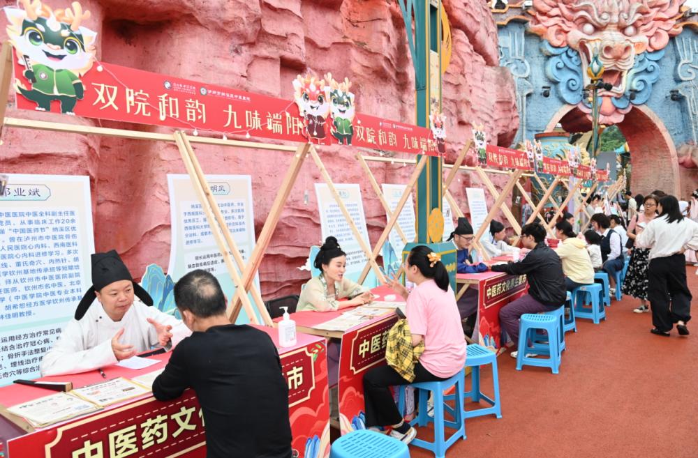 看義診做艾灸、識中藥猜謎語、喝酸梅湯打八段錦……5月31日下午6時許,瀘州山河明月·醉酒城人頭攢動,熱鬧非凡。當天,瀘州市中醫(yī)醫(yī)院聯(lián)合納溪區(qū)中醫(yī)醫(yī)院的醫(yī)護人員,在景區(qū)支起了“攤位”,一場以“雙院和韻·九味端陽”為主題的“中醫(yī)藥文化養(yǎng)生集市”活動,就此拉開序幕。