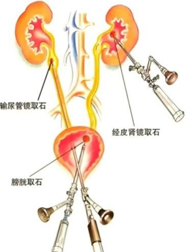 ? 3)經(jīng)皮腎鏡碎石取石術(shù)(PCNL):作為巨大腎結(jié)石的“終極解決方案”,通過腰部微小通道直達(dá)腎內(nèi)的手術(shù),是直徑>2cm腎結(jié)石、鹿角形結(jié)石(占據(jù)腎內(nèi)多個(gè)盞區(qū))的首選術(shù)式?;颊呗樽砗?,在超聲引導(dǎo)下,從腰部皮膚穿刺至腎內(nèi)結(jié)石所在的腎盞,建立一條直徑約0.5~1cm的微小通道,將腎鏡通過通道插入腎內(nèi),用鈥激光或氣壓彈道碎石機(jī)擊碎結(jié)石,再用取石鉗或負(fù)壓吸引裝置將碎石顆粒全部取出;術(shù)后需留置腎造瘺管(引流腎內(nèi)積液)和輸尿管支架管,待腎功能恢復(fù)、無出血風(fēng)險(xiǎn)后拔除。