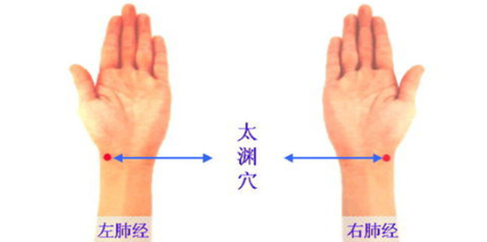 ???經絡養(yǎng)肺:將腳浸入溫水中9分鐘之后,按肺經太淵穴(位于腕前區(qū),橈骨莖突與舟狀骨之間,如圖)及任脈之膻中穴(在前正中線上,兩乳頭連線的中點,如圖)各36次,最后,還可做6次深呼吸、6次漱津吞咽。
