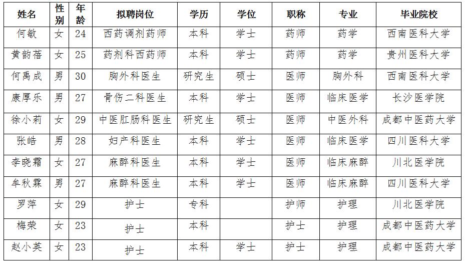 根據(jù)《瀘州市中醫(yī)醫(yī)院編外人員管理辦法》規(guī)定,經(jīng)過(guò)筆試、面試、體檢考察環(huán)節(jié),擬錄用何敏等十六人為我院編外職工,現(xiàn)將該十六名同志基本情況進(jìn)行公示,公示期5個(gè)工作日,廣大群眾如有認(rèn)為此十六名同志有不適合錄用的問(wèn)題,可以來(lái)電、來(lái)信或現(xiàn)場(chǎng)方式于2018年3月29日前,以真實(shí)姓名,實(shí)事求是地反映問(wèn)題,并提供必要...